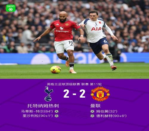 英超第11轮热刺2比2曼联84’特尔、90+1’理查利松 / 32’姆伯莫、90+6’德利赫特体坛周报全媒体原创英超第11轮,曼联客场2比2战平热刺。上半场姆伯莫头球破门,下半场特尔为热